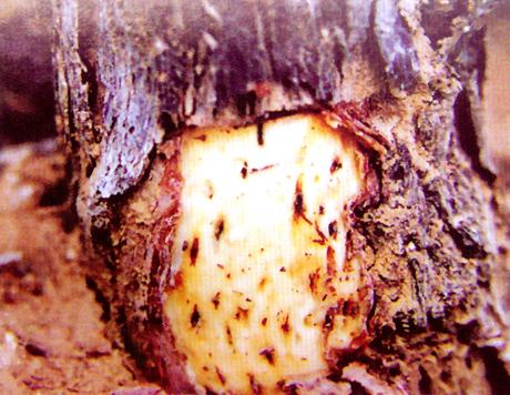 剥开树皮,会在树皮反面看到纵向的凸起纹和钉状物,而在茎的相应部位则出现凹陷的槽和纹孔。患病植株普遍矮小,长势衰弱,比健康植株晚发芽4-5周。